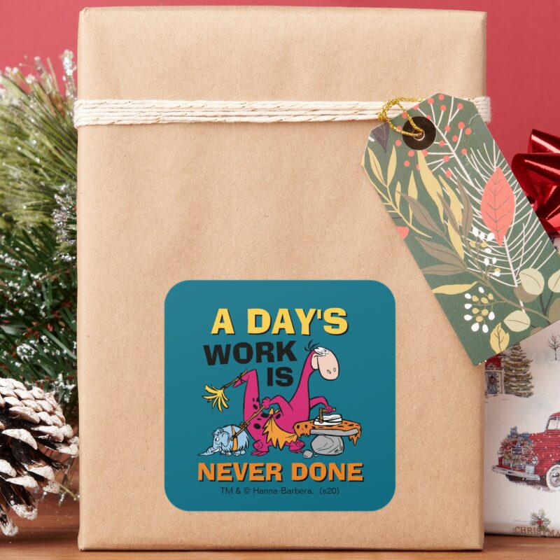 The Flintstones Dino Cleaning House Square Sticker vinyl sticker, waterproof durable collectible sticker for laptop, phone, bottle, bike, notebook, helmet, and accessories.