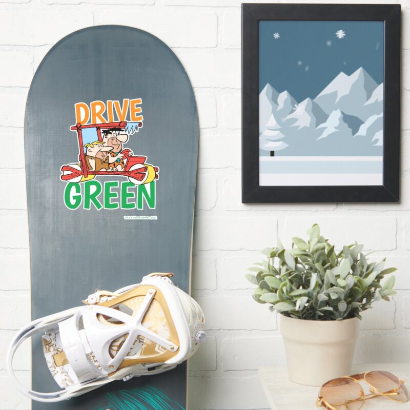 The Flintstones Fred Barney Drive Green Sticker vinyl sticker, waterproof durable collectible sticker for laptop, phone, bottle, bike, notebook, helmet, and accessories.