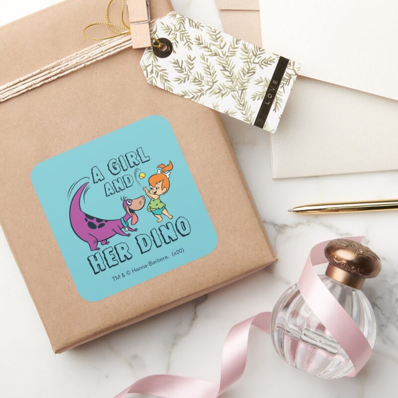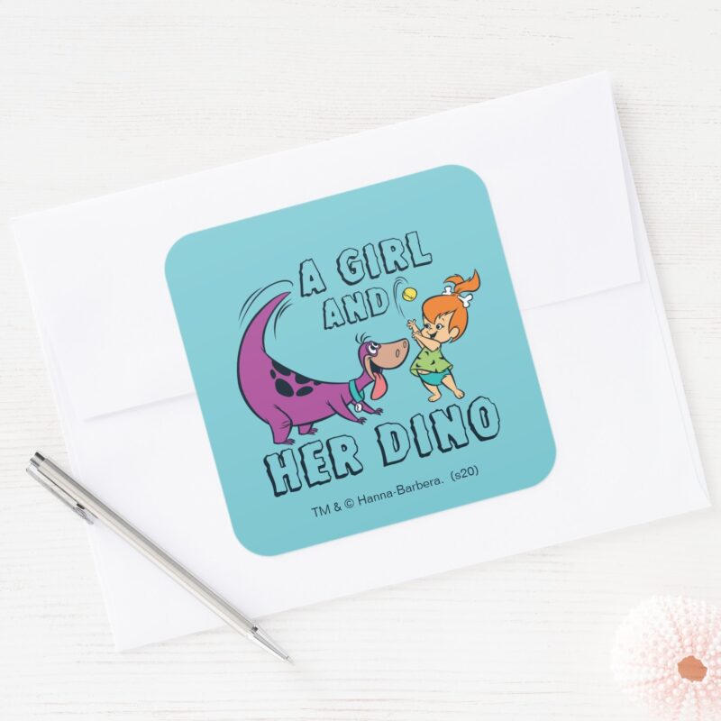 The Flintstones Pebbles Dino Play Ball Square Sticker vinyl sticker, waterproof durable collectible sticker for laptop, phone, bottle, bike, notebook, helmet, and accessories.