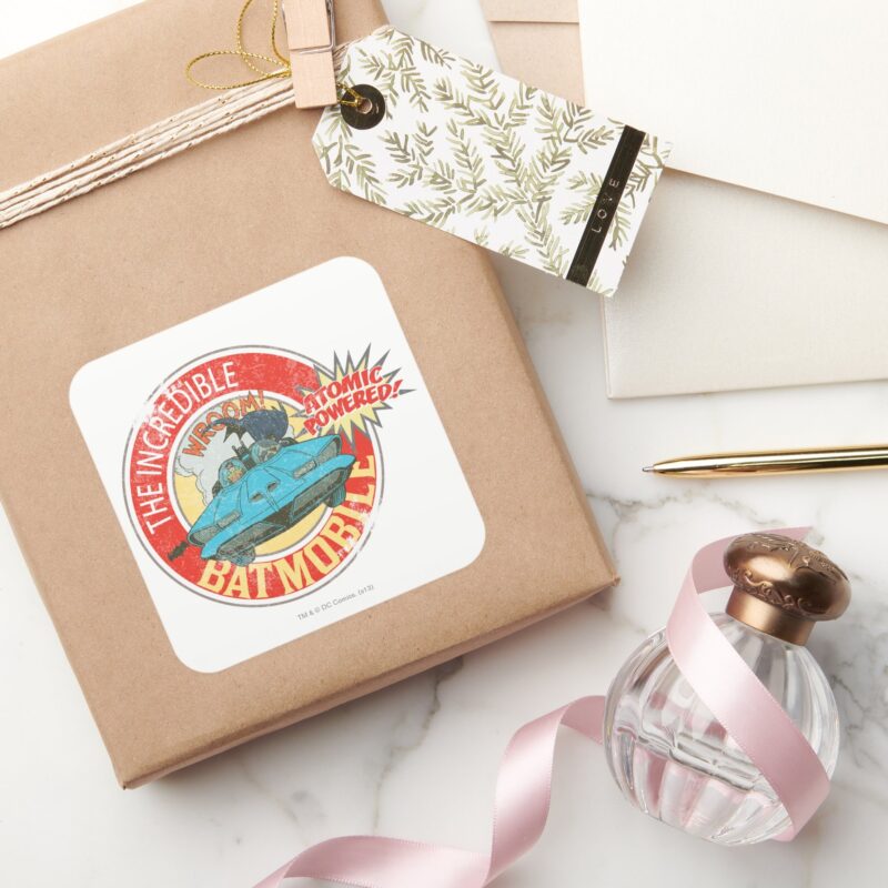 The Incredible Batmobile Icon Square Sticker vinyl sticker, waterproof durable collectible sticker for laptop, phone, bottle, bike, notebook, helmet, and accessories.