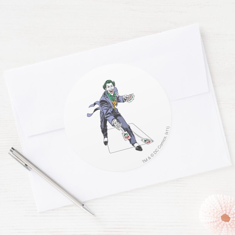 The Joker Casts Cards Classic Round Sticker vinyl sticker, waterproof durable collectible sticker for laptop, phone, bottle, bike, notebook, helmet, and accessories.