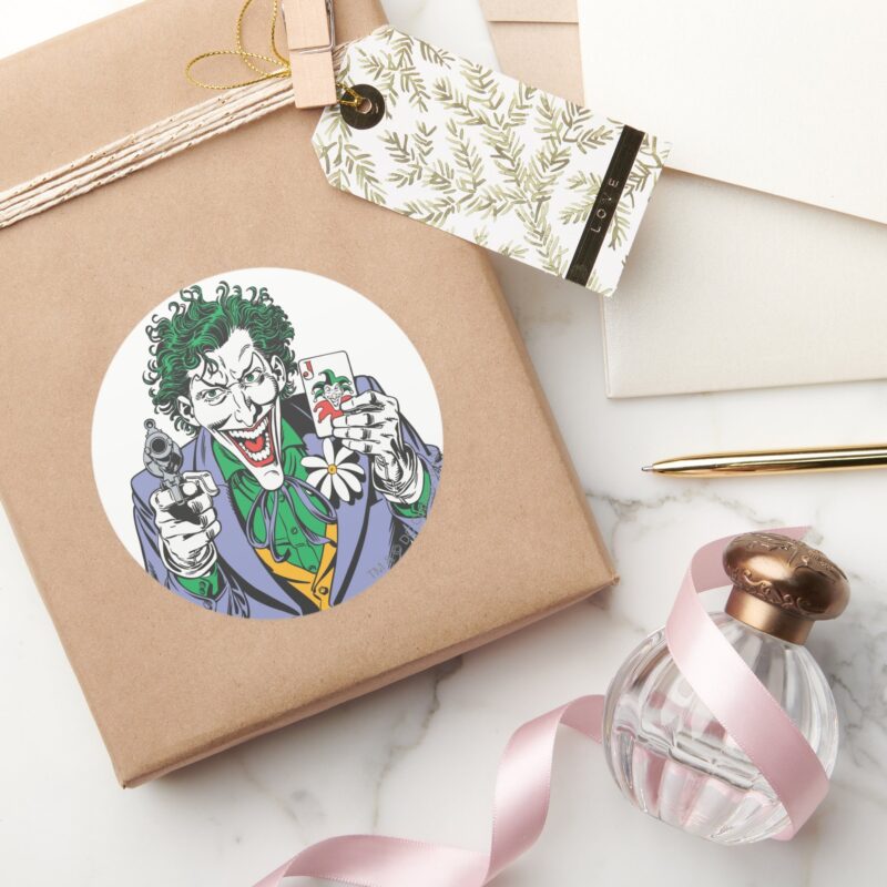 The Joker Points Gun Classic Round Sticker vinyl sticker, waterproof durable collectible sticker for laptop, phone, bottle, bike, notebook, helmet, and accessories.