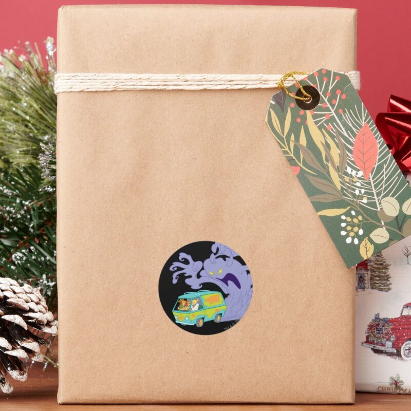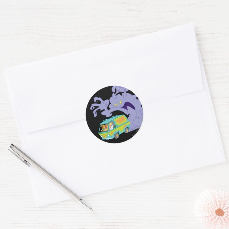 The Mystery Machine Escape Classic Round Sticker vinyl sticker, waterproof durable collectible sticker for laptop, phone, bottle, bike, notebook, helmet, and accessories.