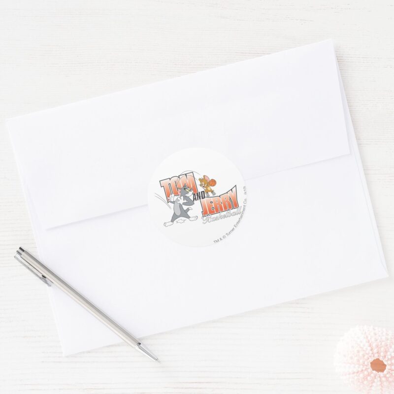 Tom And Jerry Basketball 3 Classic Round Sticker vinyl sticker, waterproof durable collectible sticker for laptop, phone, bottle, bike, notebook, helmet, and accessories.