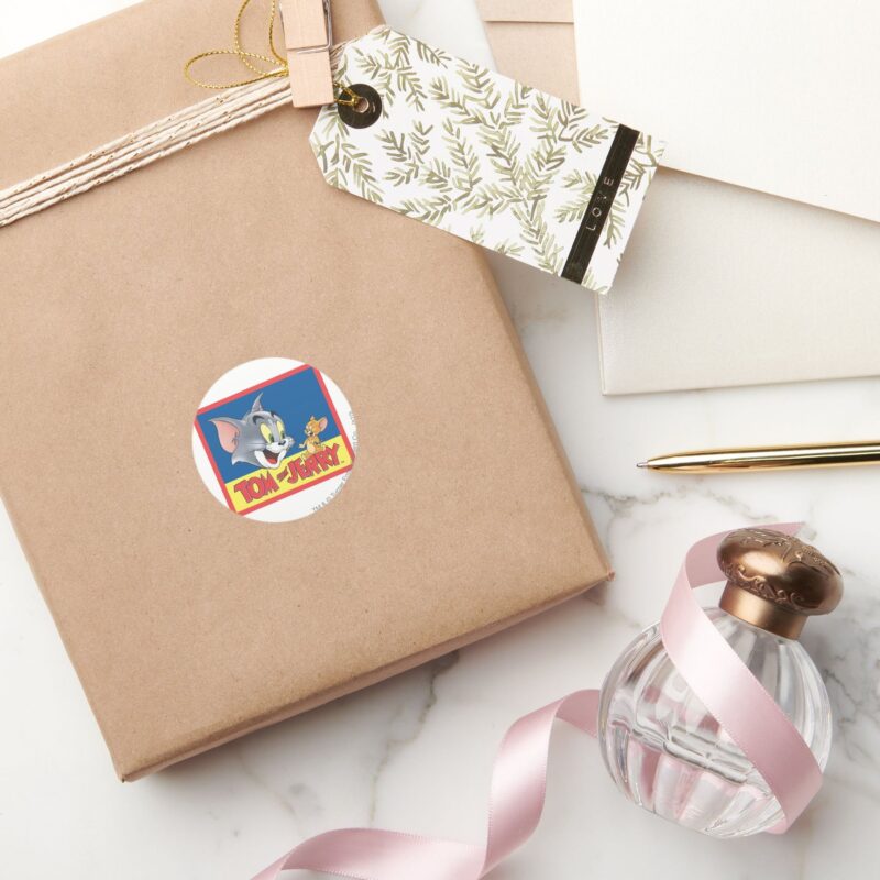 Tom And Jerry Logo Shaded Classic Round Sticker vinyl sticker, waterproof durable collectible sticker for laptop, phone, bottle, bike, notebook, helmet, and accessories.