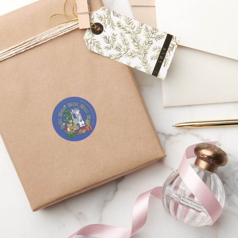Tom And Jerry Opening Presents Classic Round Sticker vinyl sticker, waterproof durable collectible sticker for laptop, phone, bottle, bike, notebook, helmet, and accessories.