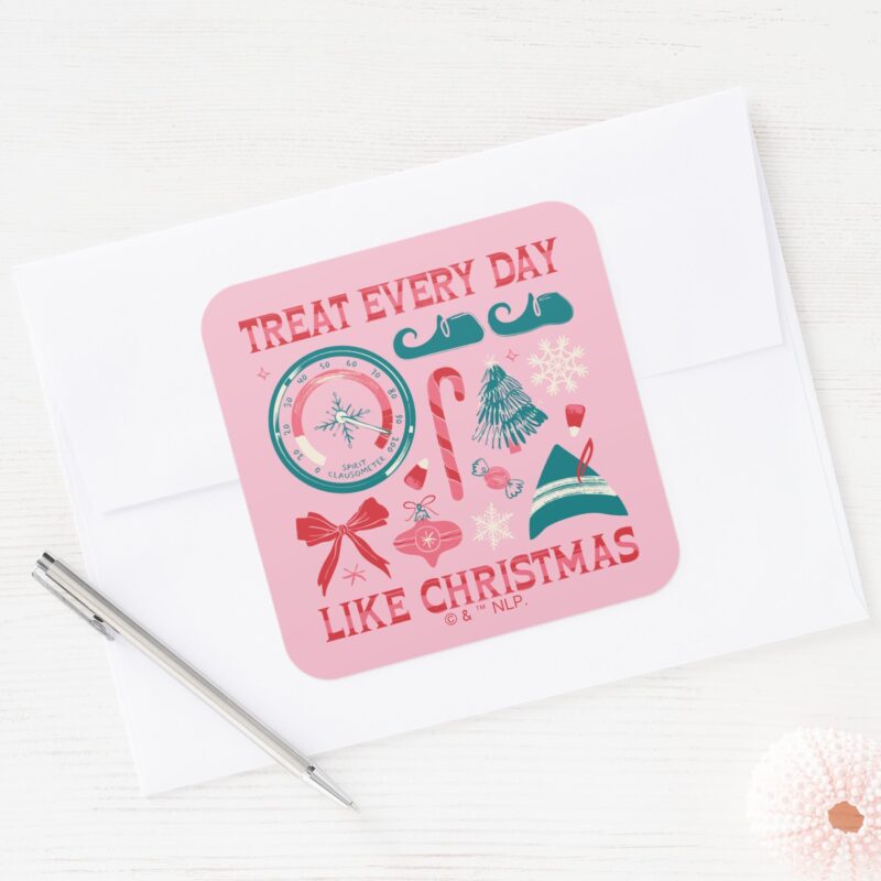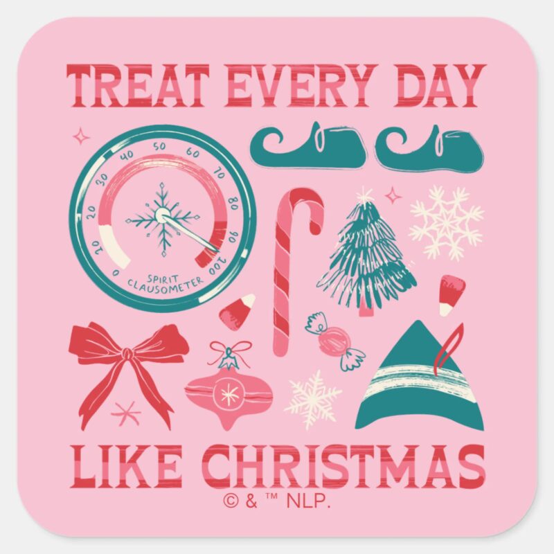 Treat Every Day Like Christmas Square Sticker vinyl sticker, waterproof durable collectible sticker for laptop, phone, bottle, bike, notebook, helmet, and accessories.