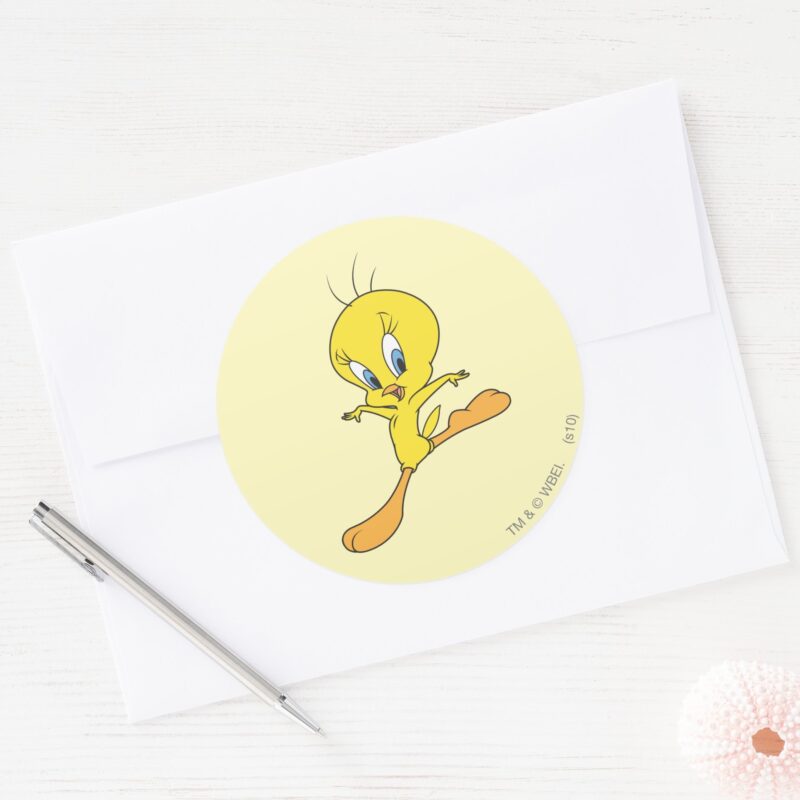 TWEETY™ Landing Classic Round Sticker vinyl sticker, waterproof durable collectible sticker for laptop, phone, bottle, bike, notebook, helmet, and accessories.