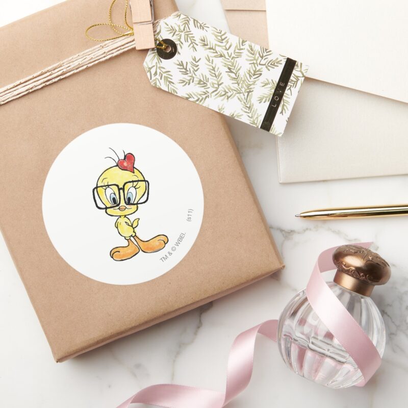 TWEETY™ Nerd Classic Round Sticker vinyl sticker, waterproof durable collectible sticker for laptop, phone, bottle, bike, notebook, helmet, and accessories.