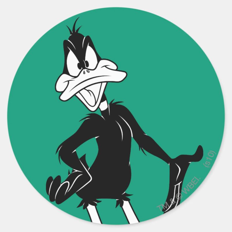 Upset DAFFY DUCK™ Classic Round Sticker vinyl sticker, waterproof durable collectible sticker for laptop, phone, bottle, bike, notebook, helmet, and accessories.