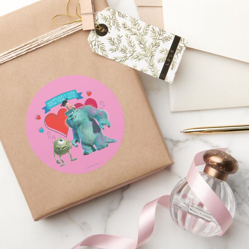Valentines Day Monsters Inc. Classic Round Sticker vinyl sticker, waterproof durable collectible sticker for laptop, phone, bottle, bike, notebook, helmet, and accessories.