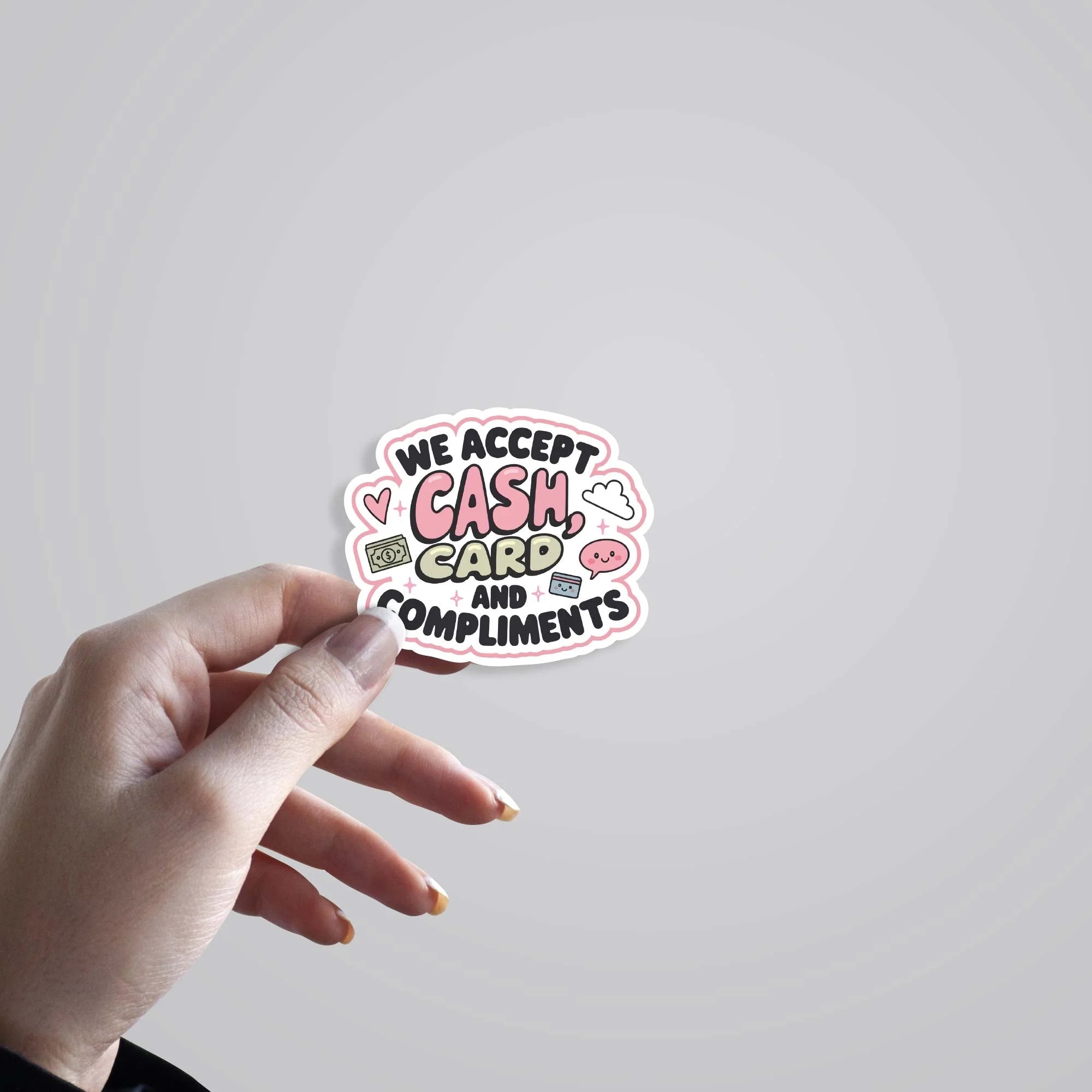 We Accept Cash Card And Compliments Witty Stickers vinyl sticker, waterproof durable collectible sticker for laptop, phone, bottle, bike, notebook, helmet, and accessories.