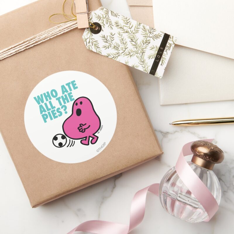 Who Ate All The Pies Classic Round Sticker vinyl sticker, waterproof durable collectible sticker for laptop, phone, bottle, bike, notebook, helmet, and accessories.