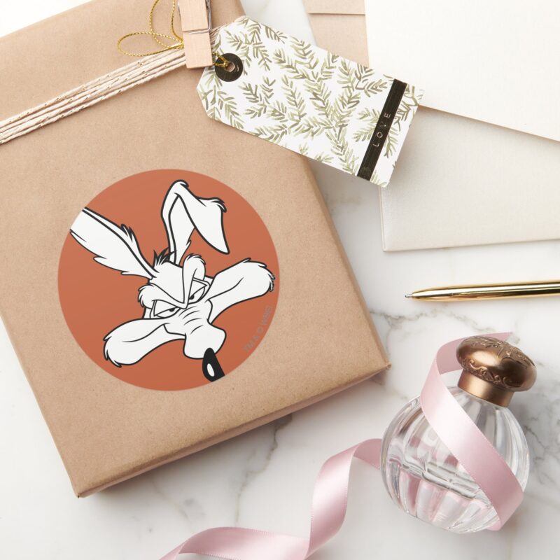 WILE E. COYOTE™ Happy Head Shot Classic Round Sticker vinyl sticker, waterproof durable collectible sticker for laptop, phone, bottle, bike, notebook, helmet, and accessories.