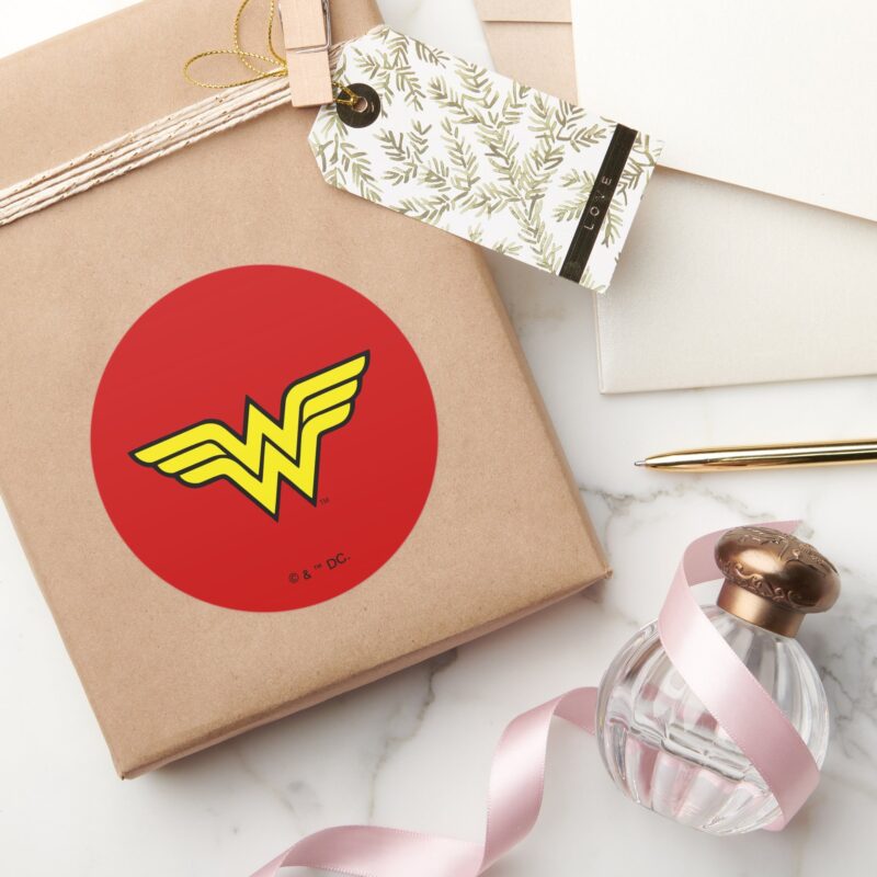 Wonder Woman Classic Logo Classic Round Sticker vinyl sticker, waterproof durable collectible sticker for laptop, phone, bottle, bike, notebook, helmet, and accessories.