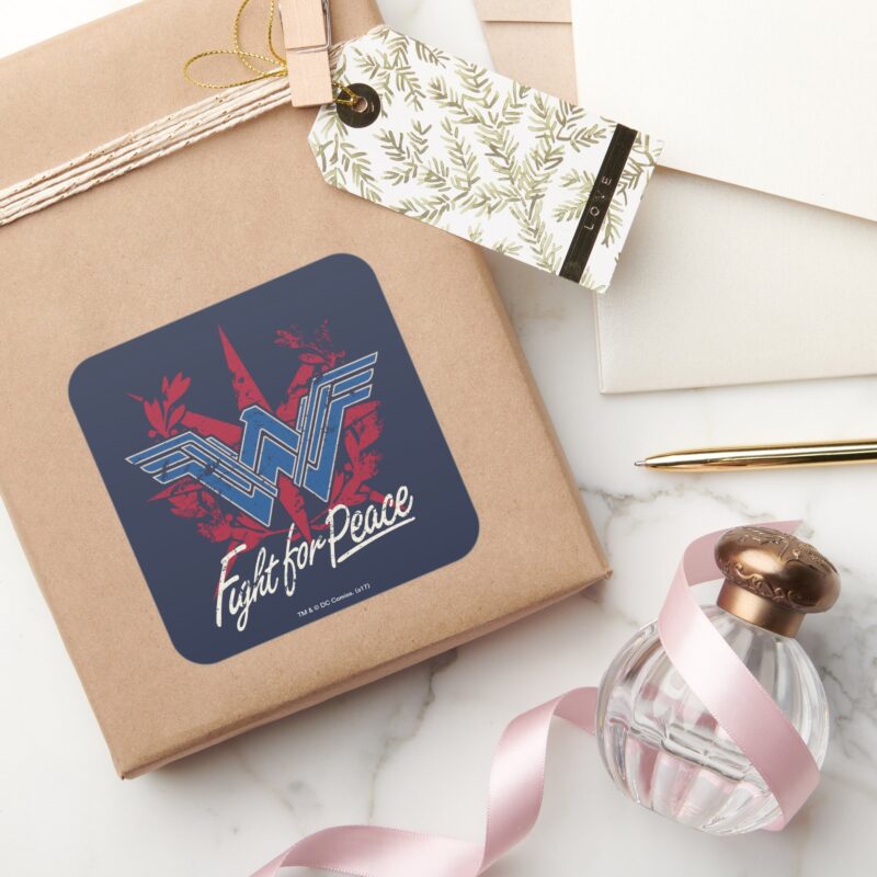 Wonder Woman Fight For Peace Symbol Square Sticker vinyl sticker, waterproof durable collectible sticker for laptop, phone, bottle, bike, notebook, helmet, and accessories.