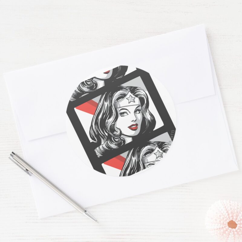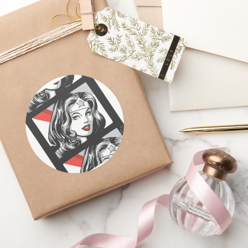 Wonder Woman Film Strip Classic Round Sticker vinyl sticker, waterproof durable collectible sticker for laptop, phone, bottle, bike, notebook, helmet, and accessories.