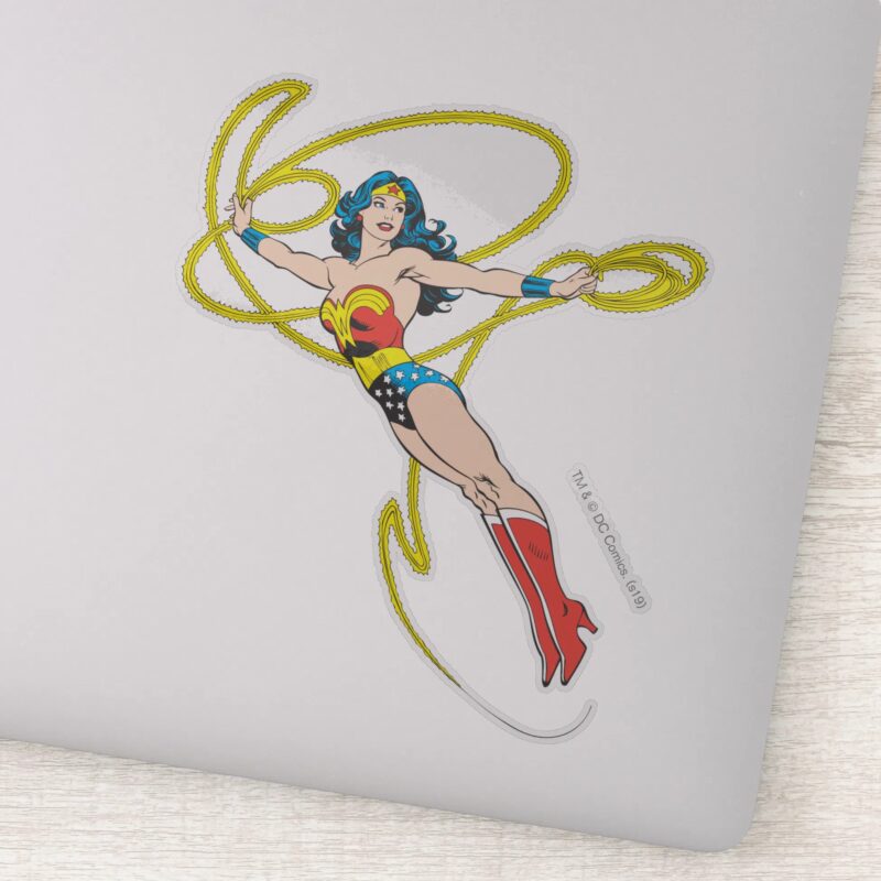 Wonder Woman Holds Lasso 4 Sticker vinyl sticker, waterproof durable collectible sticker for laptop, phone, bottle, bike, notebook, helmet, and accessories.