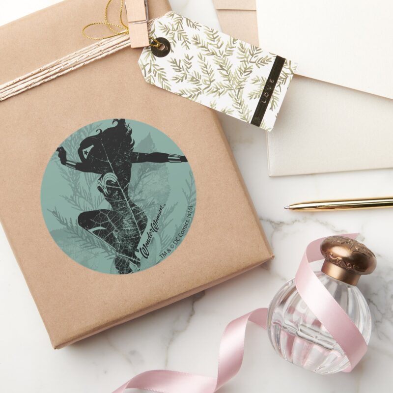 Wonder Woman Landing Foliage Graphic Classic Round Sticker vinyl sticker, waterproof durable collectible sticker for laptop, phone, bottle, bike, notebook, helmet, and accessories.