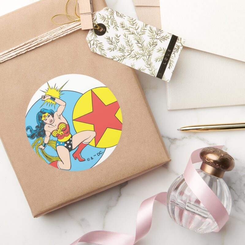 Wonder Woman Red Star Classic Round Sticker vinyl sticker, waterproof durable collectible sticker for laptop, phone, bottle, bike, notebook, helmet, and accessories.
