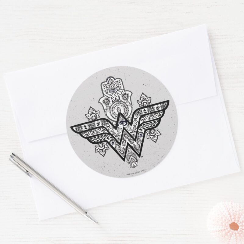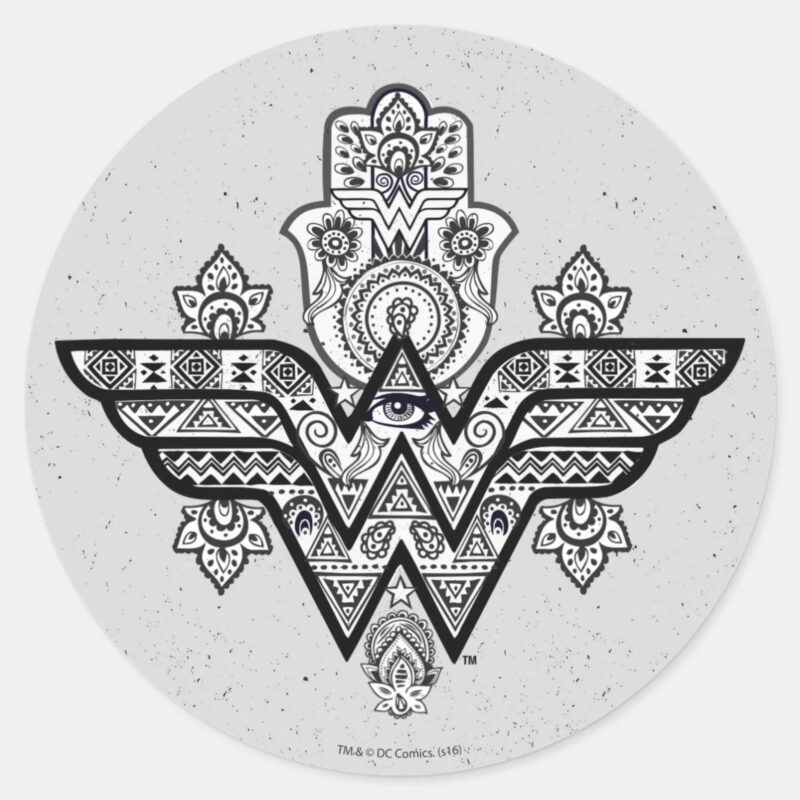 Wonder Woman Spiritual Paisley Hamsa Logo Classic Round Sticker vinyl sticker, waterproof durable collectible sticker for laptop, phone, bottle, bike, notebook, helmet, and accessories.
