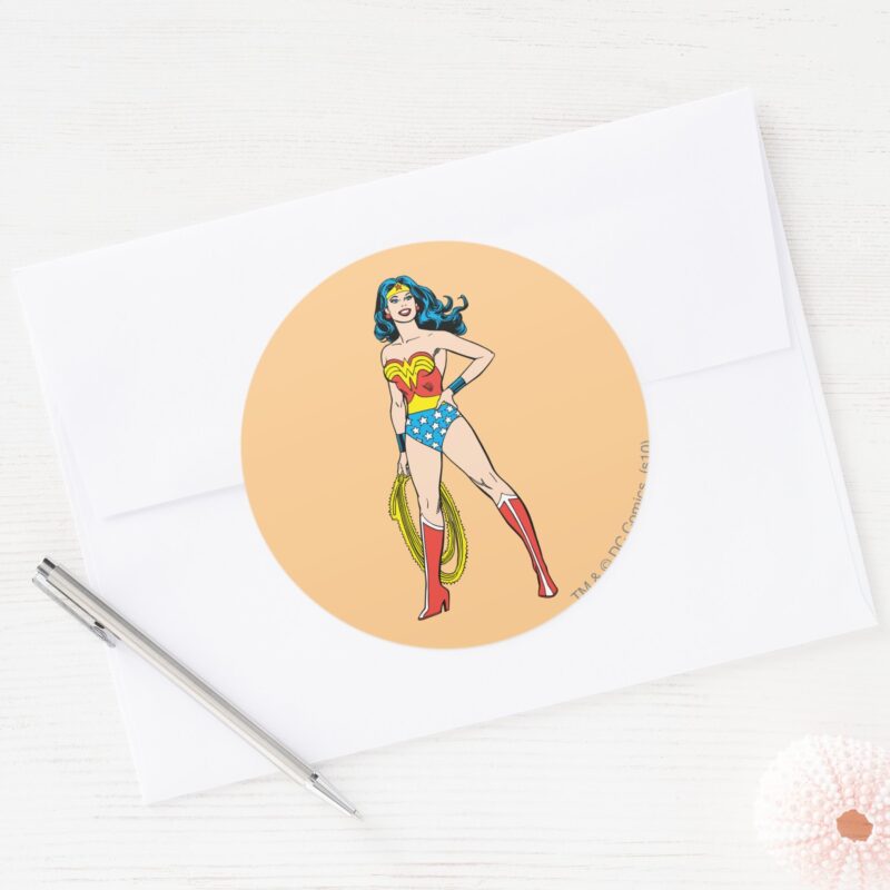 Wonder Woman Standing Classic Round Sticker vinyl sticker, waterproof durable collectible sticker for laptop, phone, bottle, bike, notebook, helmet, and accessories.