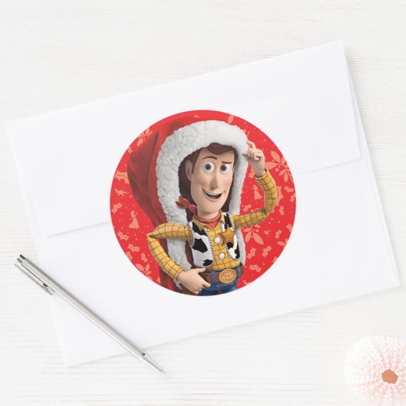 Woody In Santa Hat Classic Round Sticker vinyl sticker, waterproof durable collectible sticker for laptop, phone, bottle, bike, notebook, helmet, and accessories.