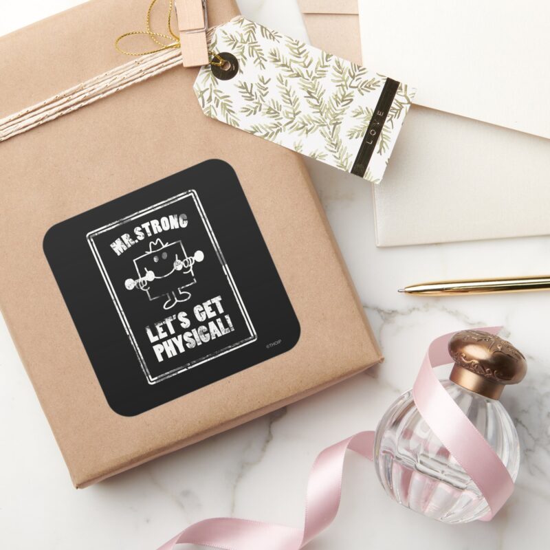 Work Out With Mr. Strong Square Sticker vinyl sticker, waterproof durable collectible sticker for laptop, phone, bottle, bike, notebook, helmet, and accessories.