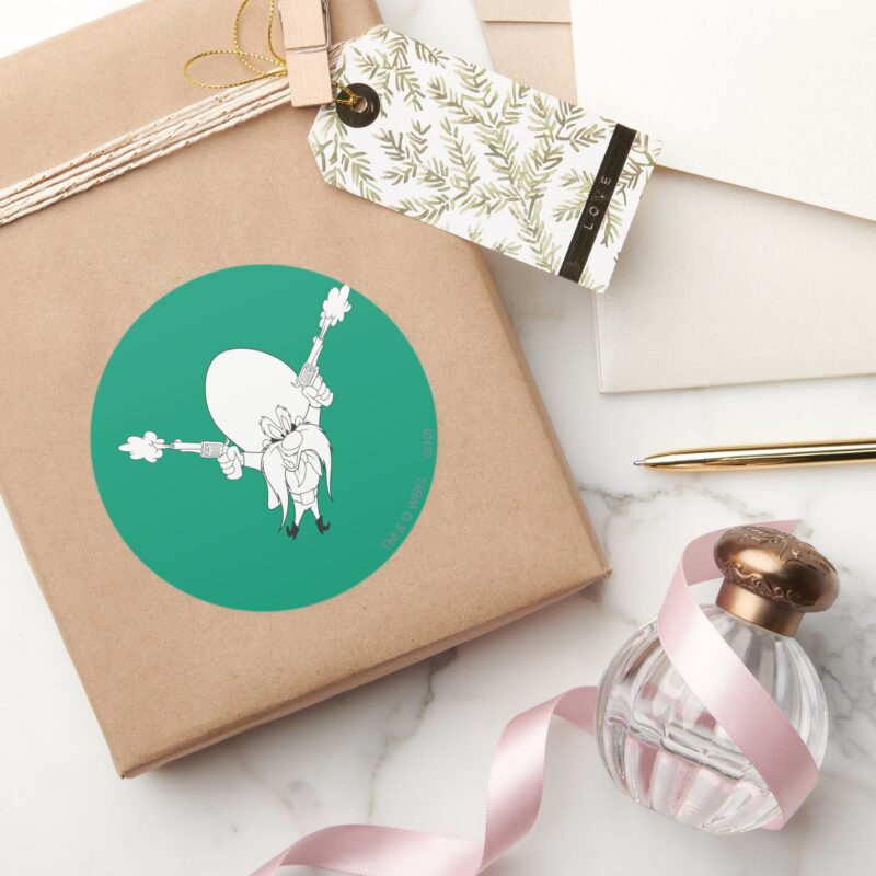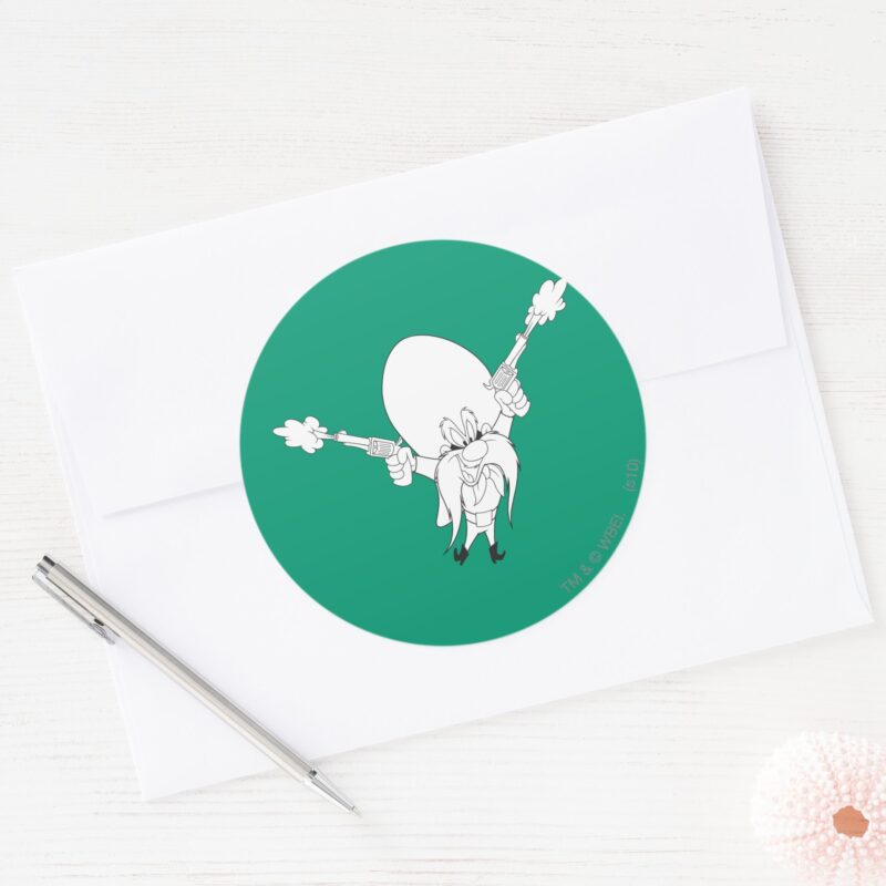 Yosemite Sam Guns Blazing Classic Round Sticker vinyl sticker, waterproof durable collectible sticker for laptop, phone, bottle, bike, notebook, helmet, and accessories.
