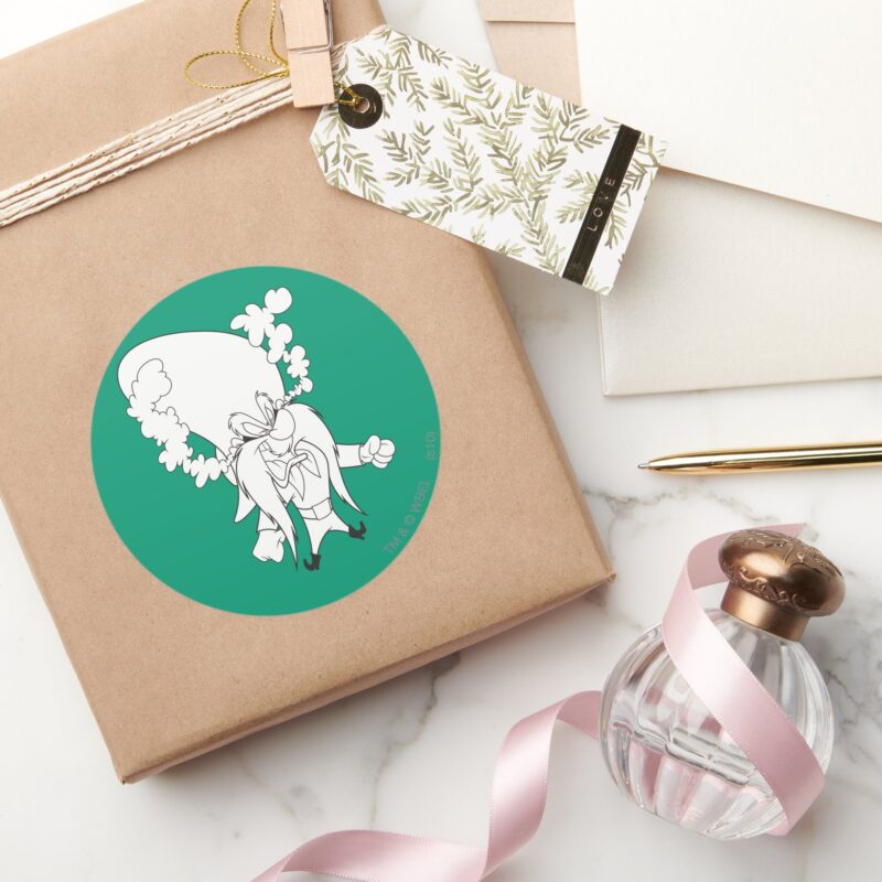 Yosemite Sam Steaming Mad Classic Round Sticker vinyl sticker, waterproof durable collectible sticker for laptop, phone, bottle, bike, notebook, helmet, and accessories.
