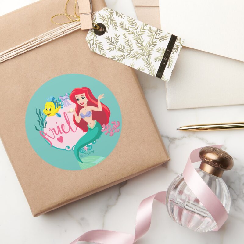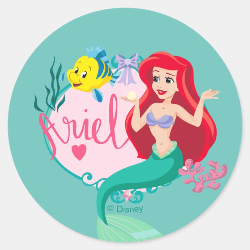 Ariel With Flounder Name Graphic Classic Round Sticker vinyl sticker, waterproof durable collectible sticker for laptop, phone, bottle, bike, notebook, helmet, and accessories.