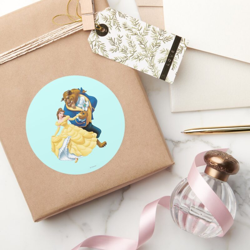 Belle And Beast Classic Round Sticker vinyl sticker, waterproof durable collectible sticker for laptop, phone, bottle, bike, notebook, helmet, and accessories.