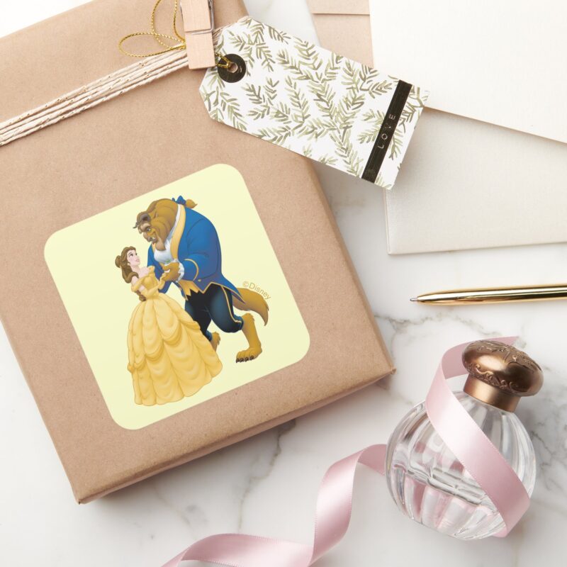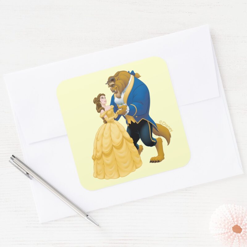 Belle And Beast Dancing Square Sticker vinyl sticker, waterproof durable collectible sticker for laptop, phone, bottle, bike, notebook, helmet, and accessories.