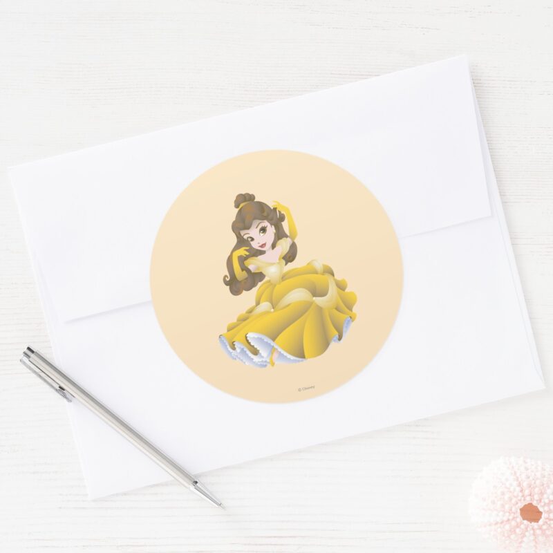 Belle Posing Classic Round Sticker vinyl sticker, waterproof durable collectible sticker for laptop, phone, bottle, bike, notebook, helmet, and accessories.