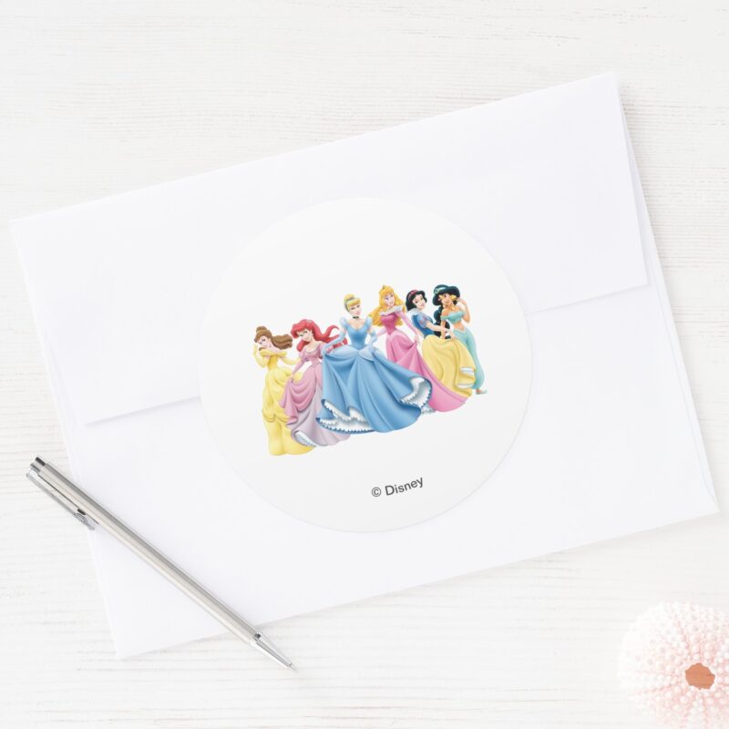 Disney Princess Holding Dresses Out Classic Round Sticker vinyl sticker, waterproof durable collectible sticker for laptop, phone, bottle, bike, notebook, helmet, and accessories.