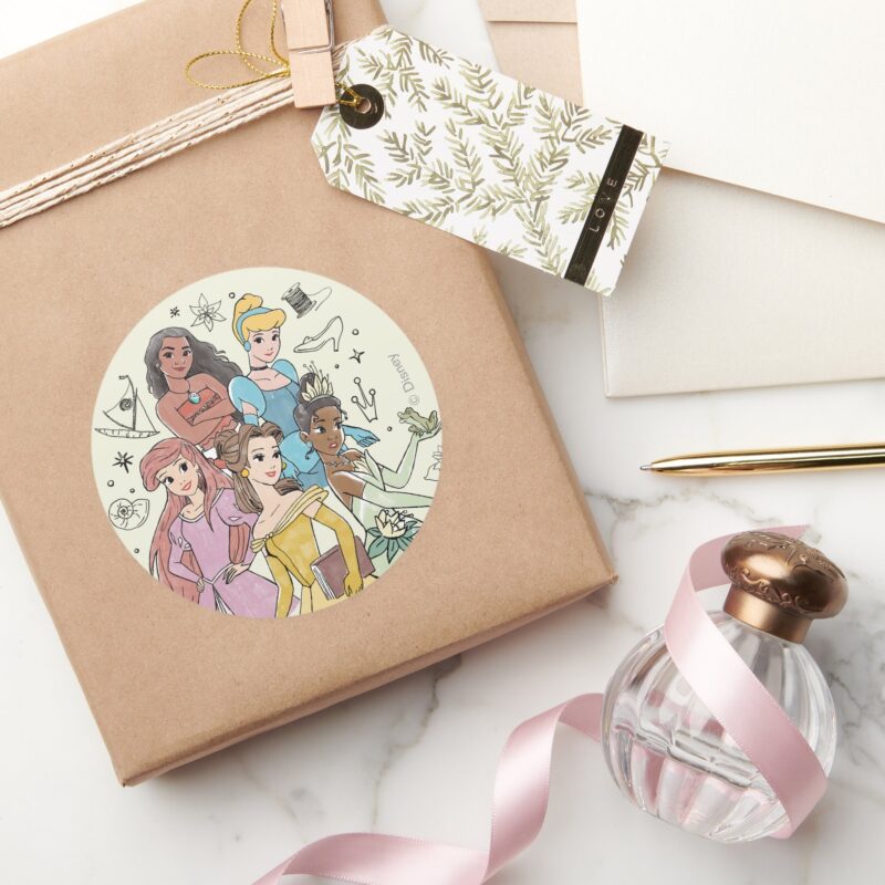Disney Princess Marker Doodles Classic Round Sticker vinyl sticker, waterproof durable collectible sticker for laptop, phone, bottle, bike, notebook, helmet, and accessories.