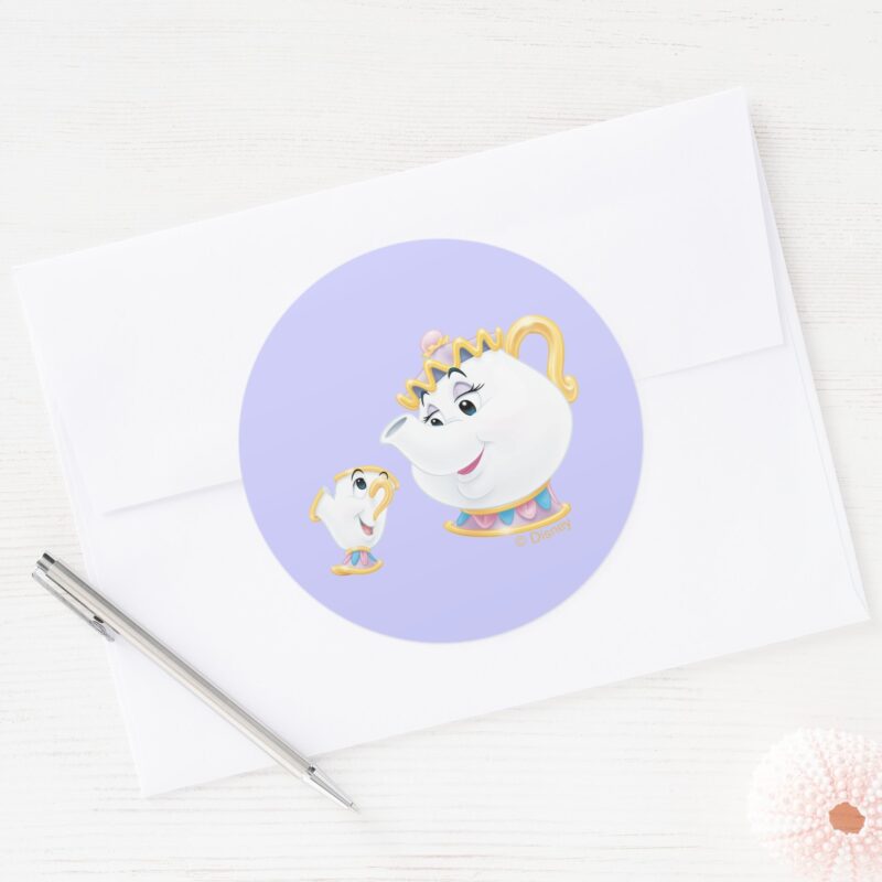 Mrs. Potts And Chip Classic Round Sticker vinyl sticker, waterproof durable collectible sticker for laptop, phone, bottle, bike, notebook, helmet, and accessories.
