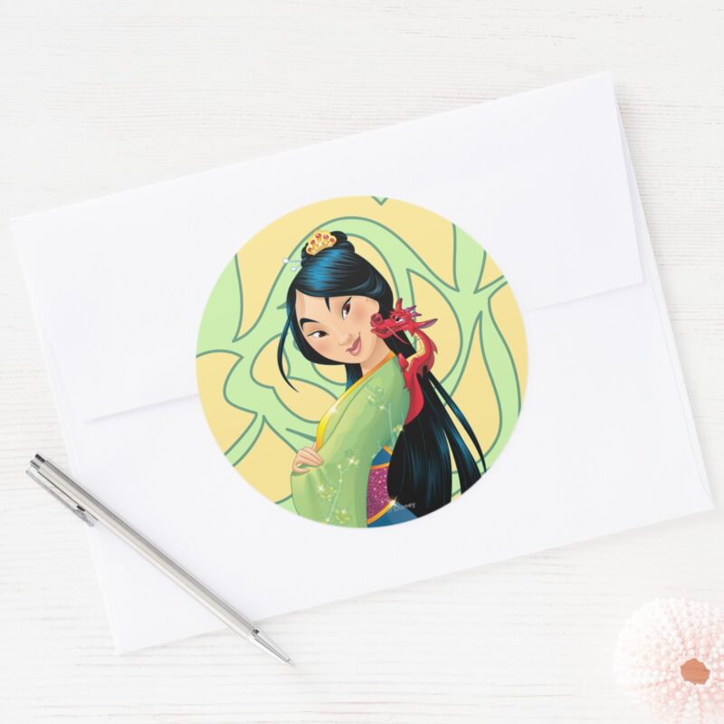 Mulan And Mushu Classic Round Sticker vinyl sticker, waterproof durable collectible sticker for laptop, phone, bottle, bike, notebook, helmet, and accessories.