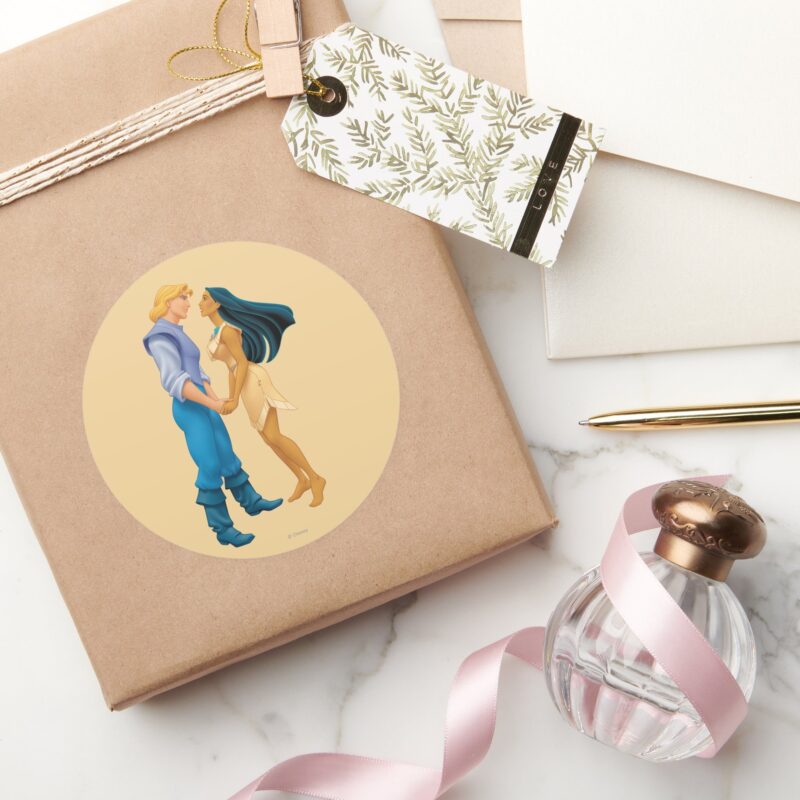 Pocahontas And John Smith Holding Hands Classic Round Sticker vinyl sticker, waterproof durable collectible sticker for laptop, phone, bottle, bike, notebook, helmet, and accessories.