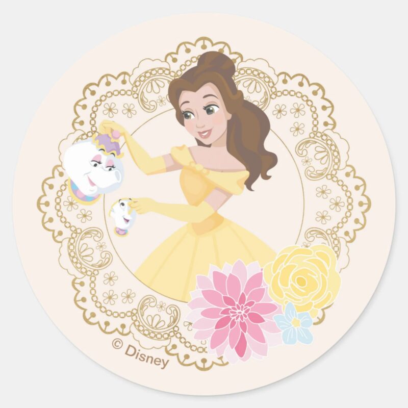 Princess Belle Floral Gold Confetti Classic Round Sticker vinyl sticker, waterproof durable collectible sticker for laptop, phone, bottle, bike, notebook, helmet, and accessories.