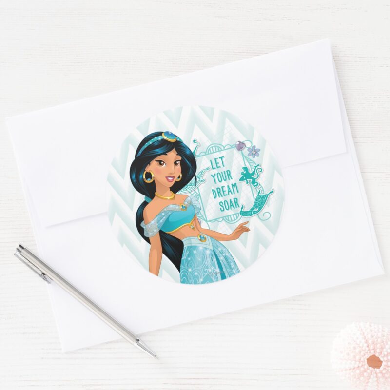 Princess Jasmine Classic Round Sticker vinyl sticker, waterproof durable collectible sticker for laptop, phone, bottle, bike, notebook, helmet, and accessories.