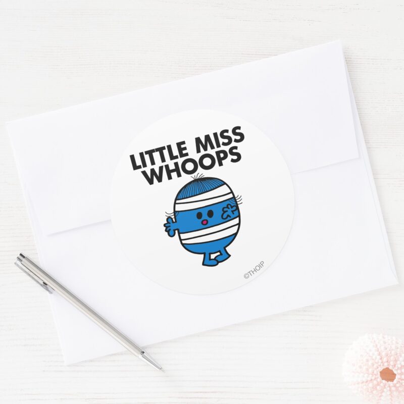Bandaged Little Miss Whoops Classic Round Sticker vinyl sticker, waterproof durable collectible sticker for laptop, phone, bottle, bike, notebook, helmet, and accessories.