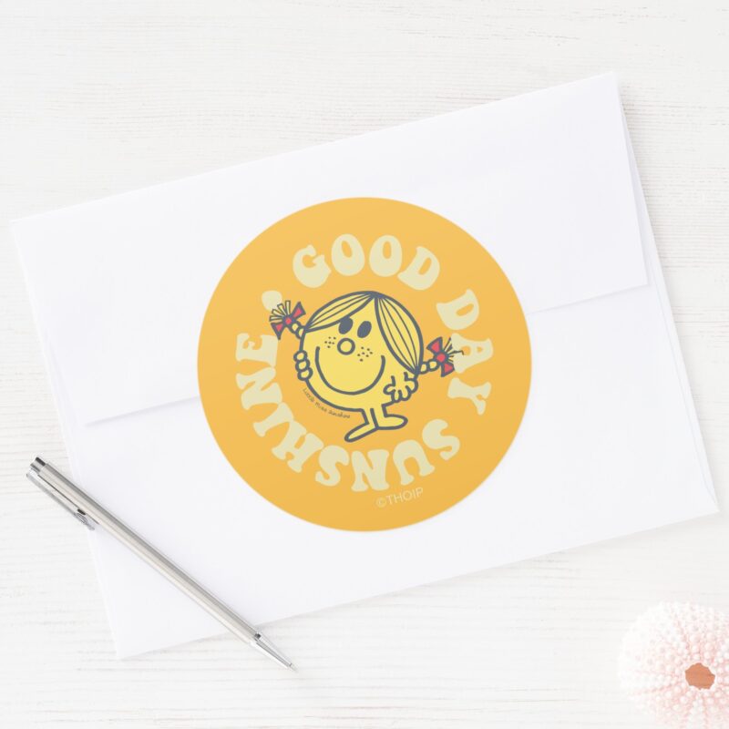 Good Day Little Miss Sunshine Classic Round Sticker vinyl sticker, waterproof durable collectible sticker for laptop, phone, bottle, bike, notebook, helmet, and accessories.