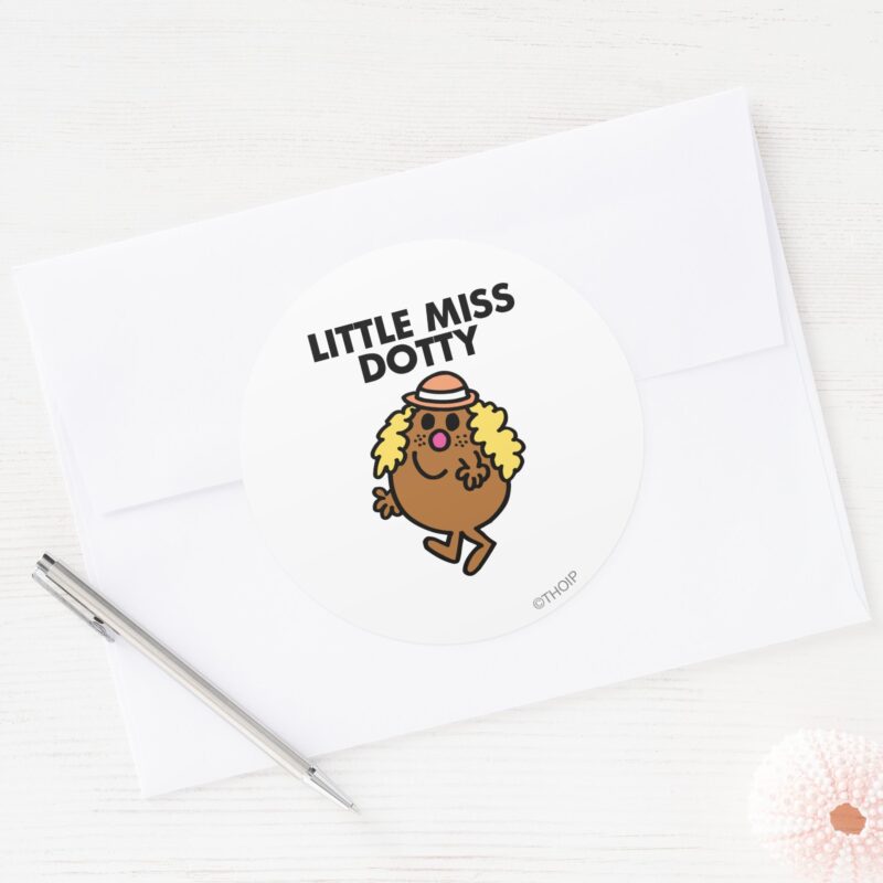 Little Miss Dotty Waving Classic Round Sticker vinyl sticker, waterproof durable collectible sticker for laptop, phone, bottle, bike, notebook, helmet, and accessories.