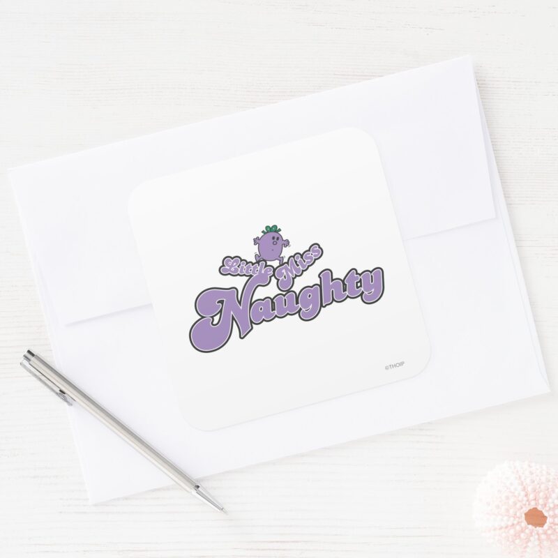 Little Miss Naughty Balancing Act Square Sticker vinyl sticker, waterproof durable collectible sticker for laptop, phone, bottle, bike, notebook, helmet, and accessories.