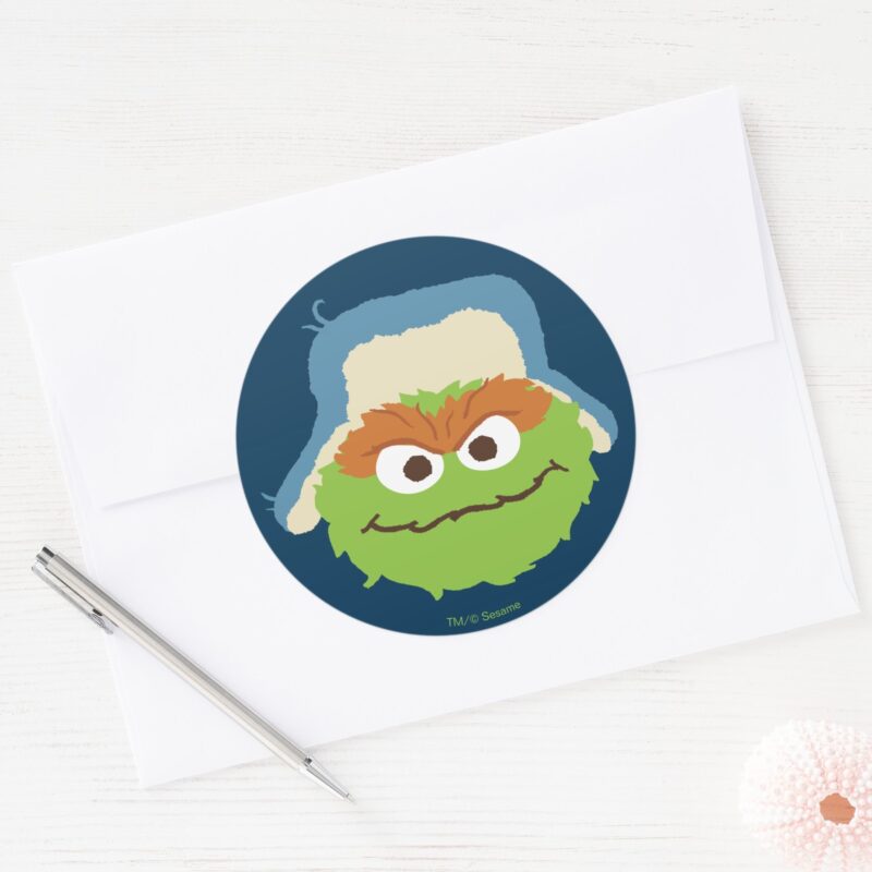 Oscar The Grouch Woodland Face Classic Round Sticker vinyl sticker, waterproof durable collectible sticker for laptop, phone, bottle, bike, notebook, helmet, and accessories.