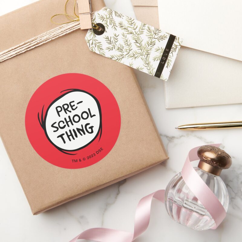 Cat In The Hat Preschool Thing Classic Round Sticker vinyl sticker, waterproof durable collectible sticker for laptop, phone, bottle, bike, notebook, helmet, and accessories.