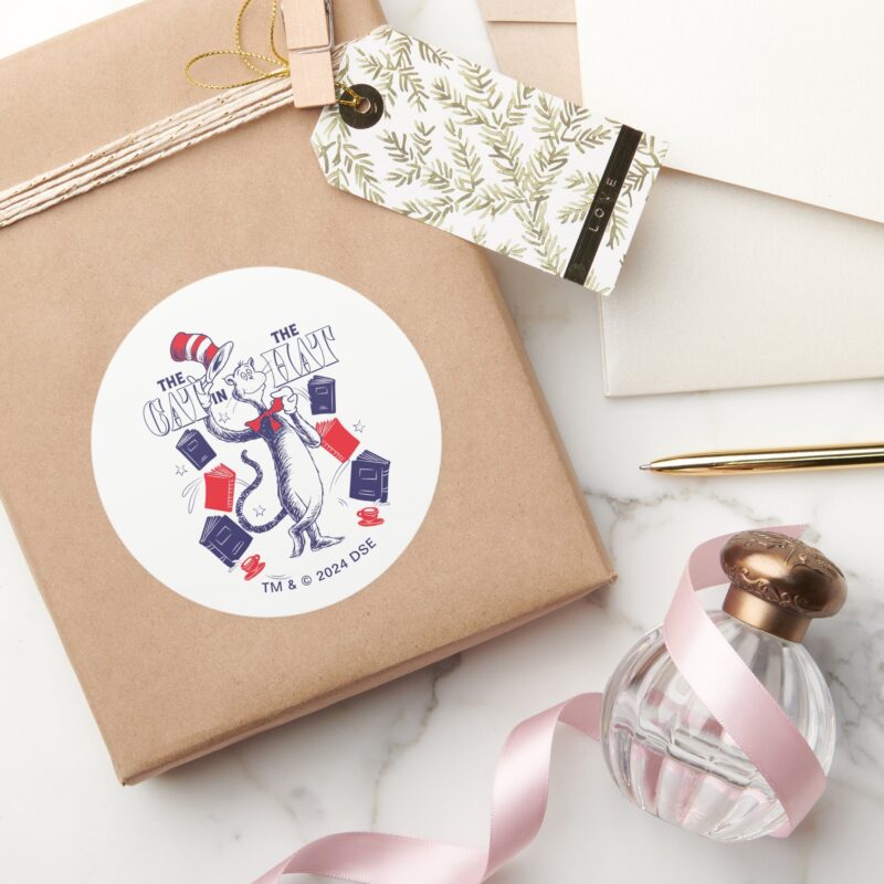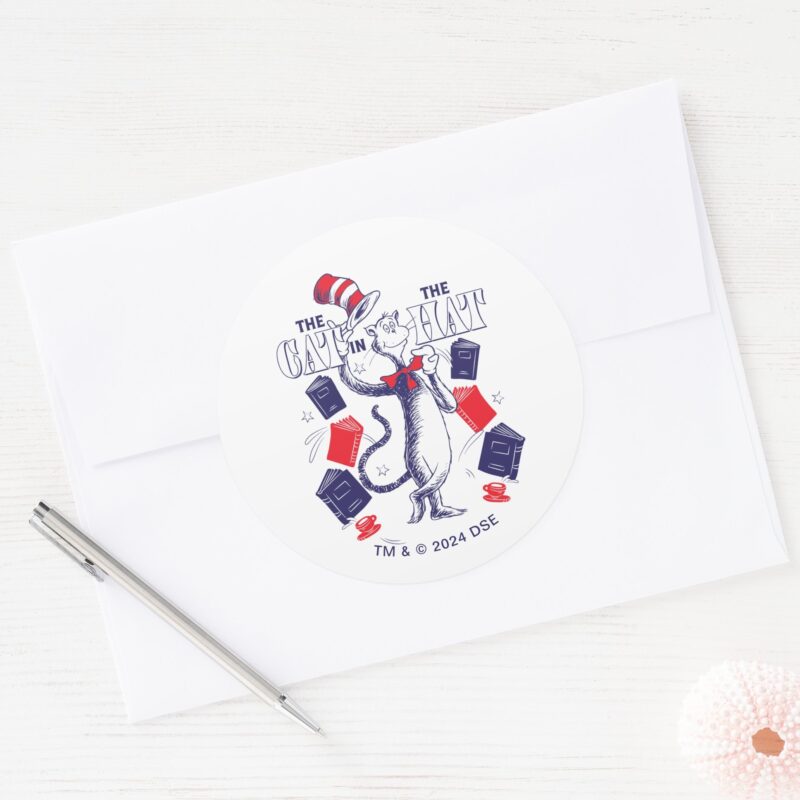 Cat In The Hat Reading Books Classic Round Sticker vinyl sticker, waterproof durable collectible sticker for laptop, phone, bottle, bike, notebook, helmet, and accessories.
