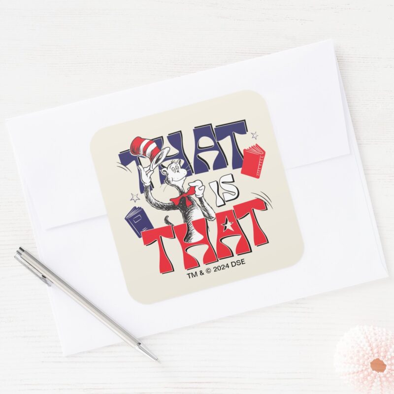 Cat In The Hat That Is That Square Sticker vinyl sticker, waterproof durable collectible sticker for laptop, phone, bottle, bike, notebook, helmet, and accessories.