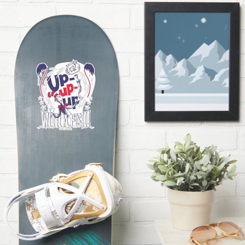 Cat In The Hat Up Up Up With A Fish Sticker vinyl sticker, waterproof durable collectible sticker for laptop, phone, bottle, bike, notebook, helmet, and accessories.